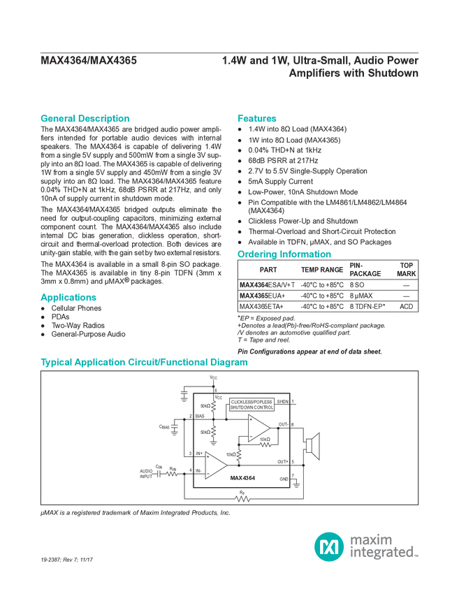 MAX4364 1.4W and 1W, Ultra-Small, Audio Power Amplifiers with Shutdown
