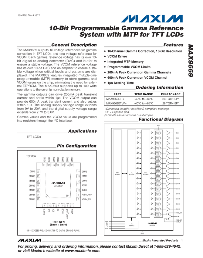 MAX9669 10-Bit Programmable Gamma Reference System with MTP for TFT LCDs