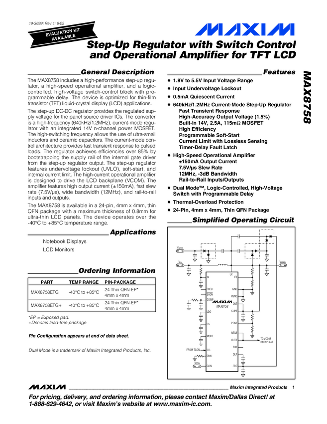 MAX8758 Step-Up Regulator with Switch Control and Operational Amplifier for TFT LCD