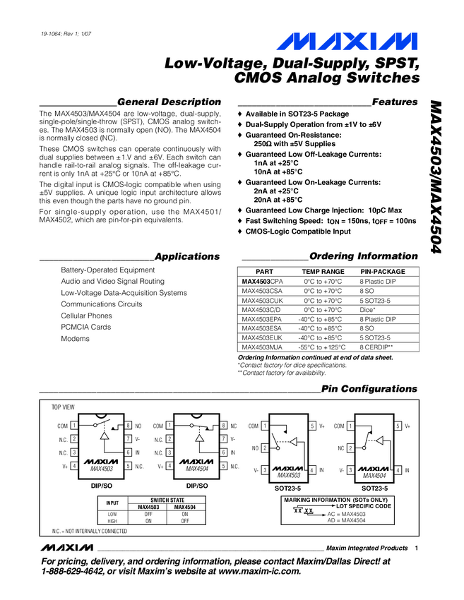 MAX4503 Low-Voltage, Dual-Supply, SPST, CMOS Analog Switches