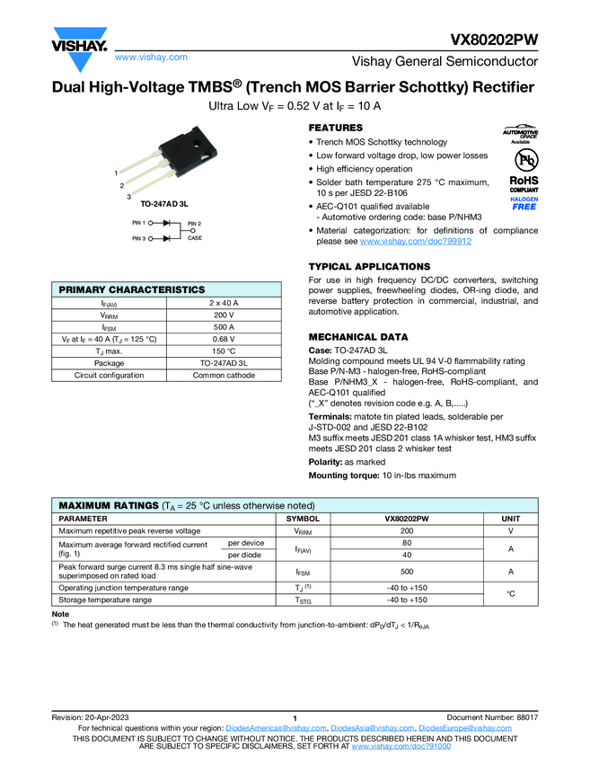 VX80202PW Dual High-Voltage TMBS® (Trench MOS Barrier Schottky) Rectifier Ultra...