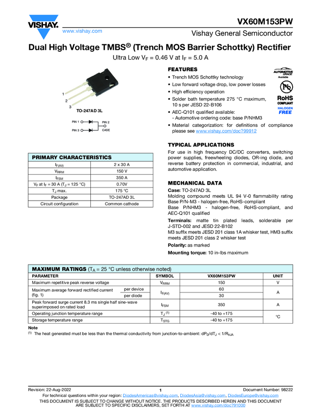 VX60M153PW Dual High Voltage TMBS® (Trench MOS Barrier Schottky) Rectifier Ultra...