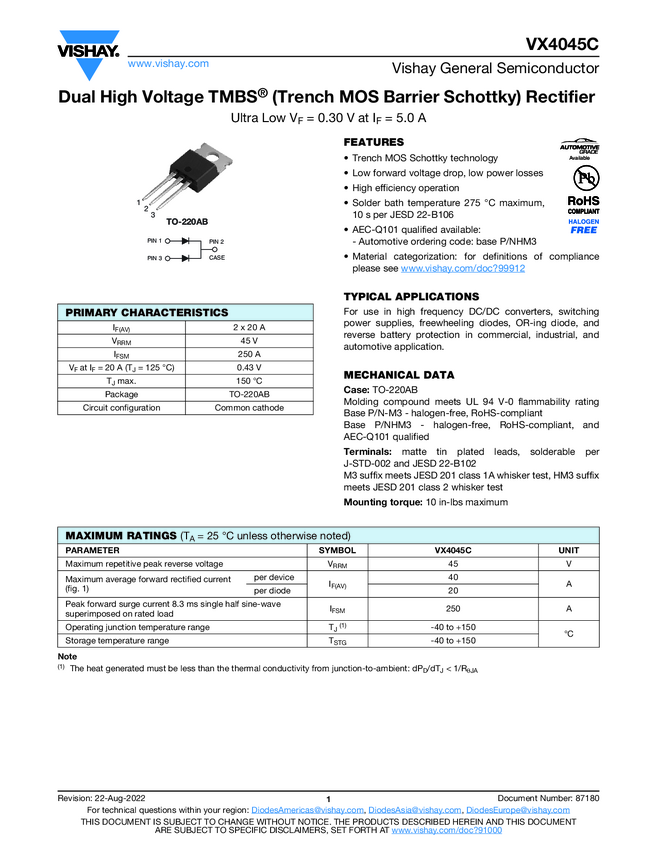 VX4045C Dual High Voltage TMBS® (Trench MOS Barrier Schottky) Rectifier Ultra...