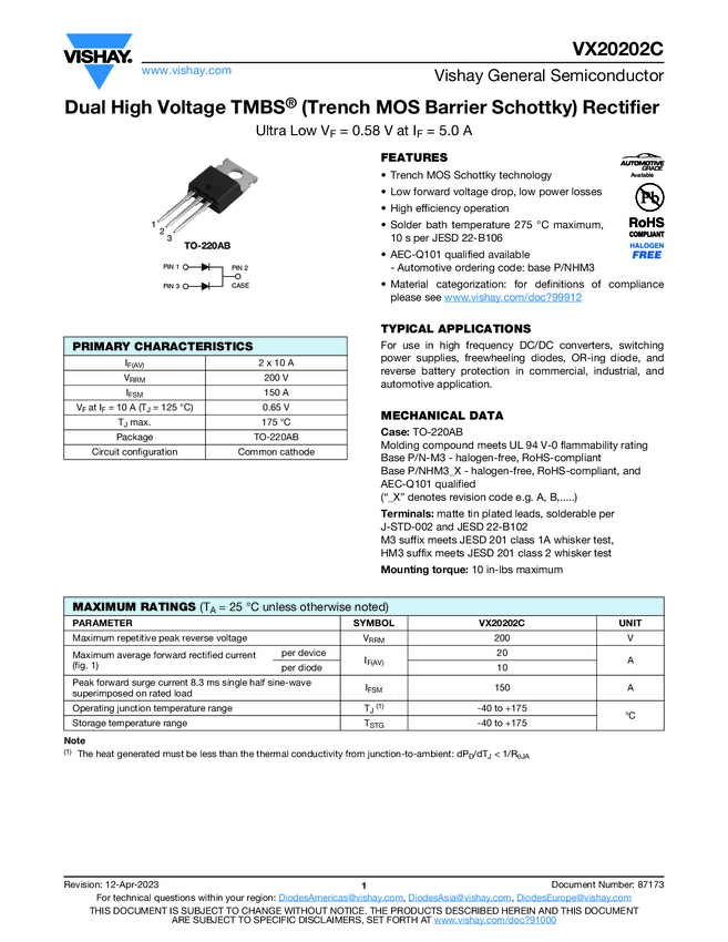 VX20202C Dual High Voltage TMBS® (Trench MOS Barrier Schottky) Rectifier Ultra...