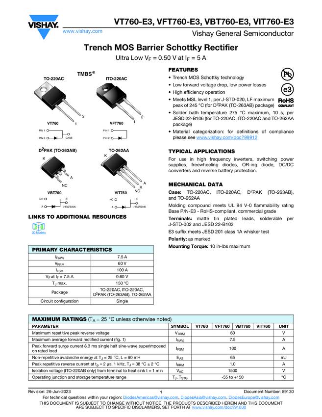 VT760-E3 Trench MOS Barrier Schottky Rectifier Ultra Low VF = 0.50 V at IF = 5 A