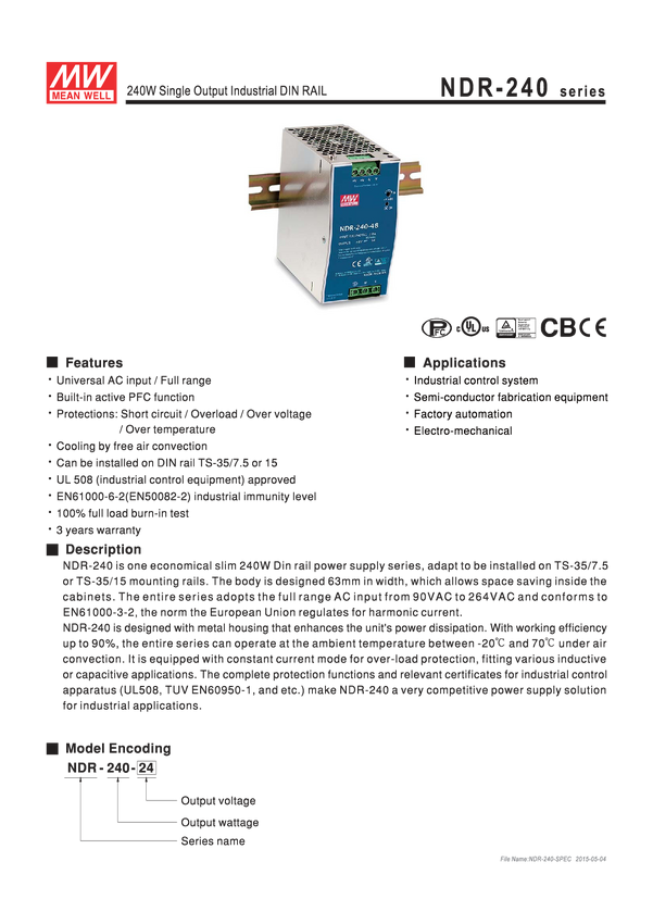 NDR-240-24 Zasilacz; NDR-240-24; na szynę DIN; 24V DC; 10A; 240W; sygnalizacyjna dioda...