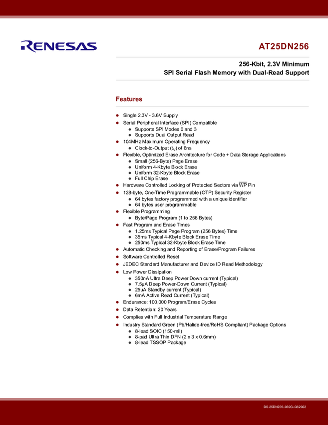 AT25DN256 256Kbit, 2.3V to 3.6V Range SPI Serial Flash Memory with Dual-Read Support