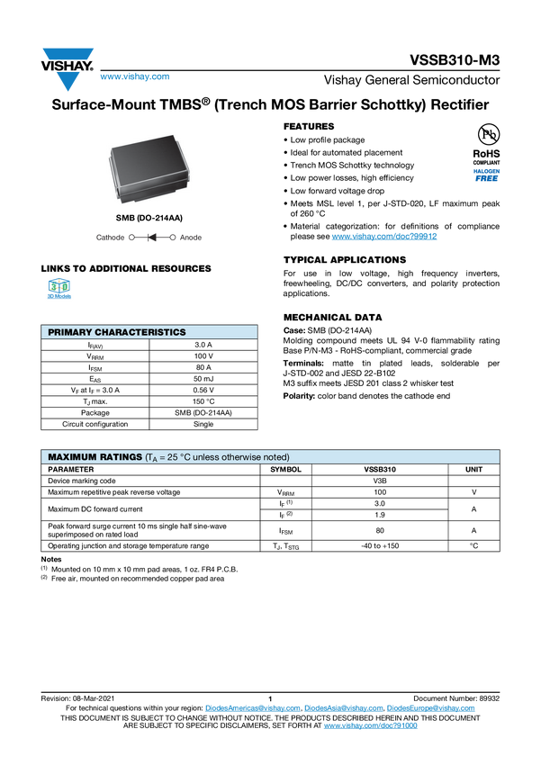 VSSB310-M3 Surface-Mount TMBS® (Trench MOS Barrier Schottky) Rectifier