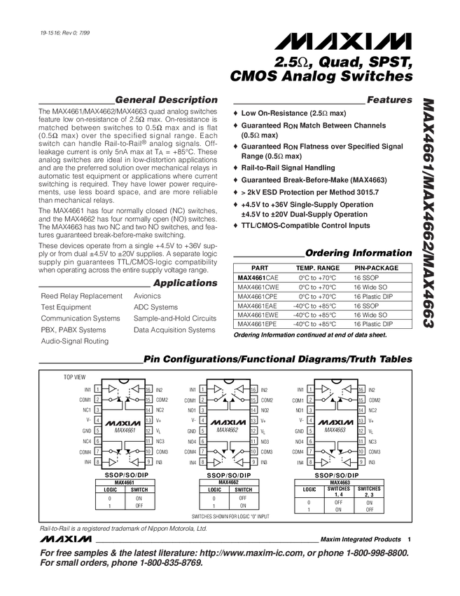 MAX4663 2.5 Ohm Quad, SPST, CMOS Analog Switches