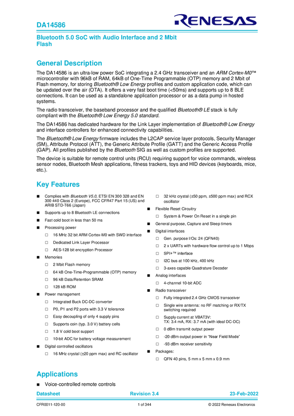 DA14586 SmartBond™ Bluetooth 5.0 SoC with Audio Interface and 2Mbit Flash