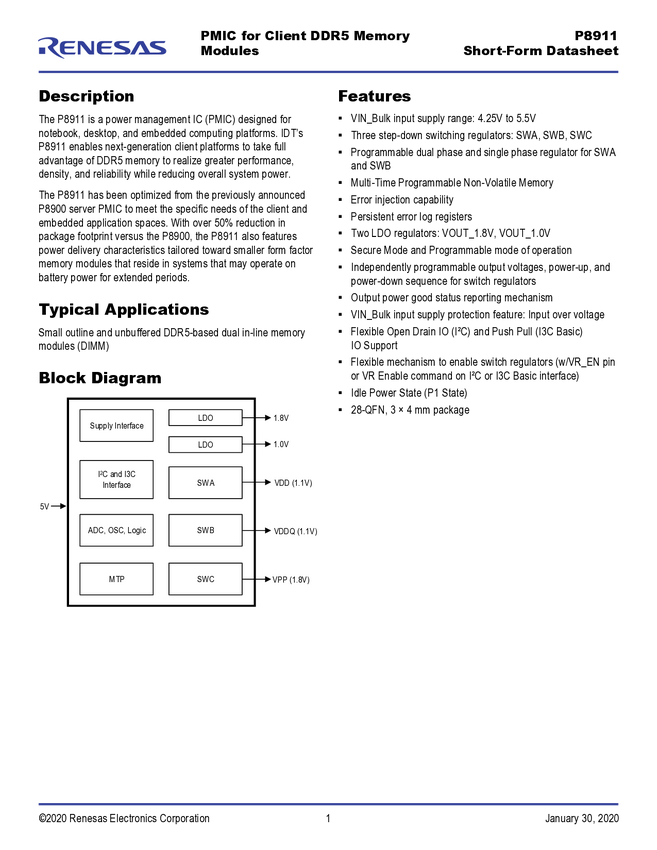 P8911 DDR5 Client PMIC for UDIMMs and SODIMMs
