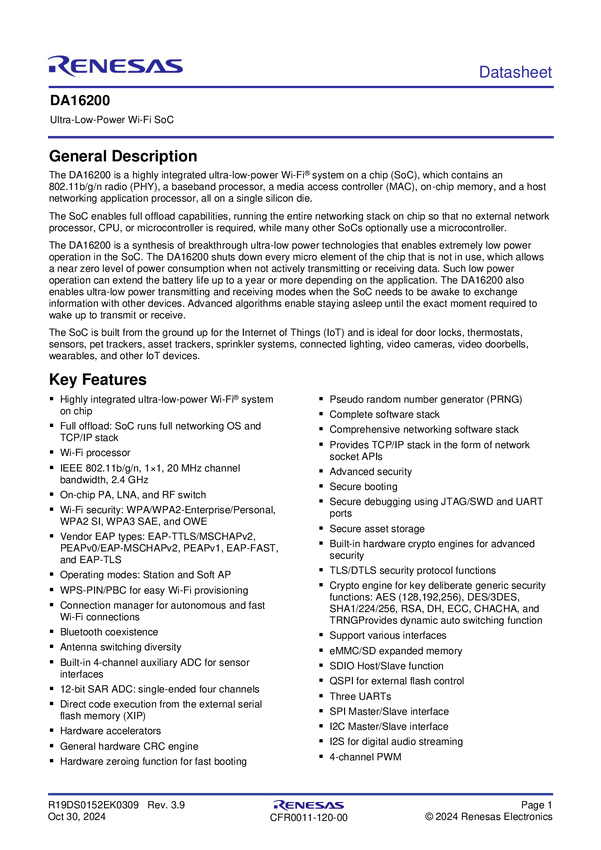 DA16200 Ultra-Low Power Wi-Fi SoC for Battery-Powered IoT Devices