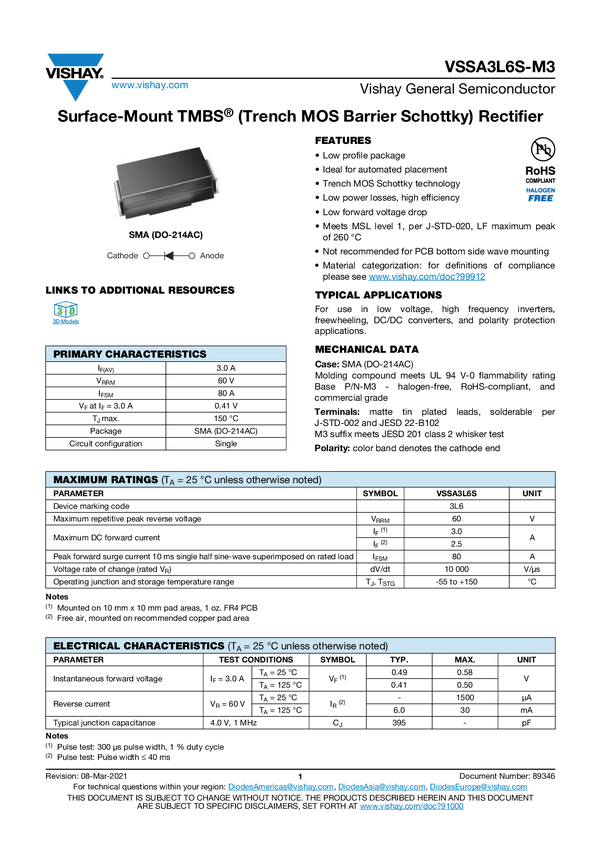 VSSA3L6S-M3 Surface-Mount TMBS® (Trench MOS Barrier Schottky) Rectifier