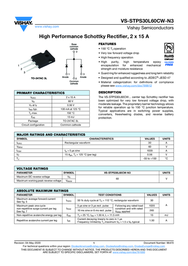VS-STPS30L60CW-N3 High Performance Schottky Rectifier, 2 x 15 A