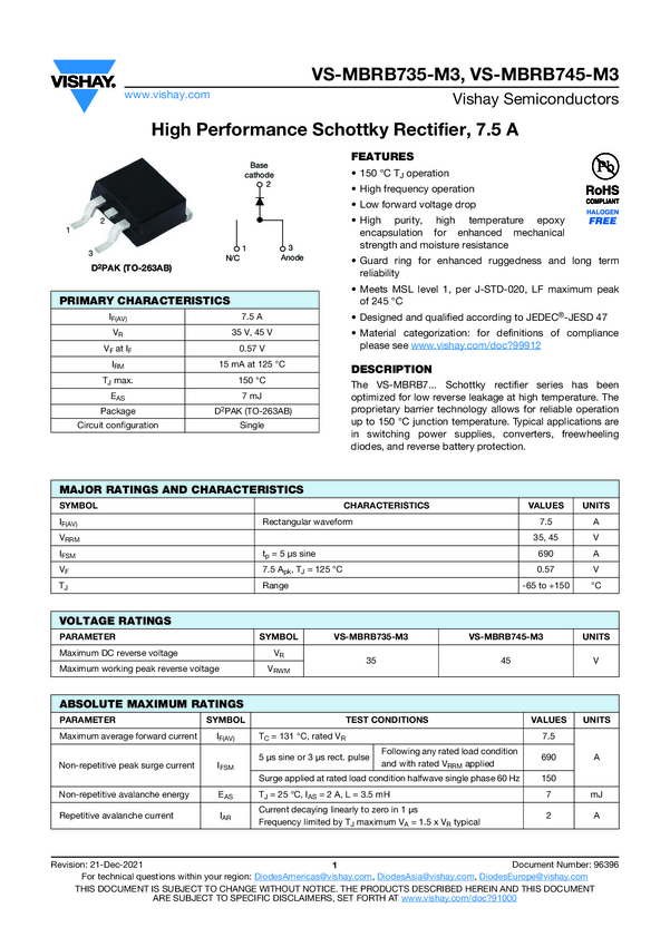 VS-MBRB745-M3 High Performance Schottky Rectifier, 7.5 A