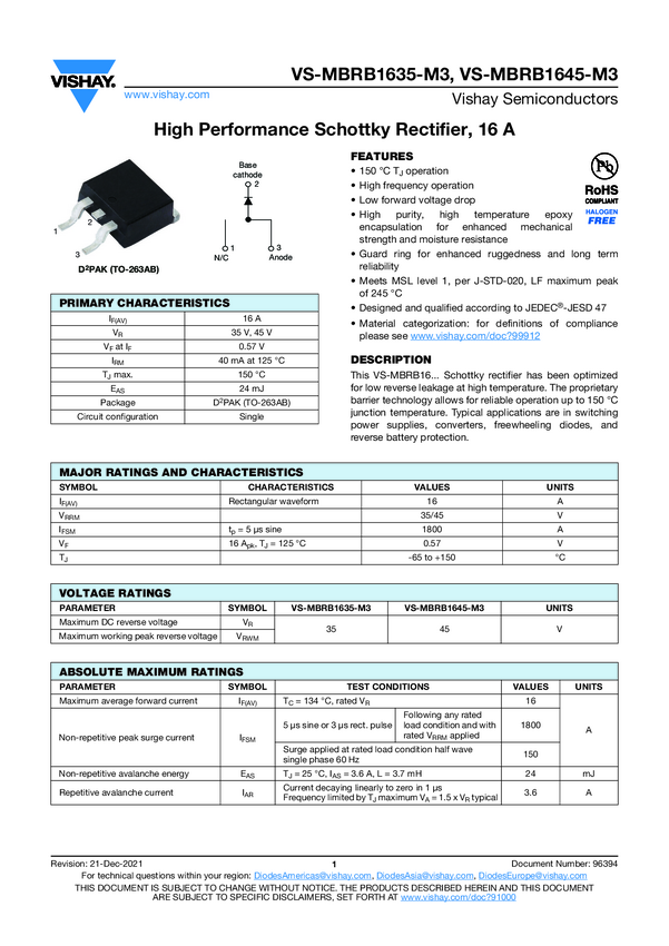 VS-MBRB1645-M3 High Performance Schottky Rectifier, 16 A