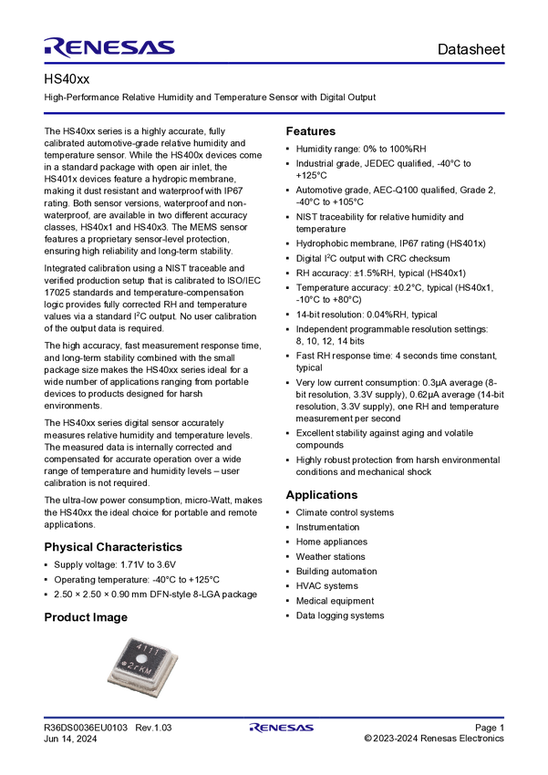 HS4003 Relative Humidity and Temperature Sensor, Digital Output, ±2.5% RH