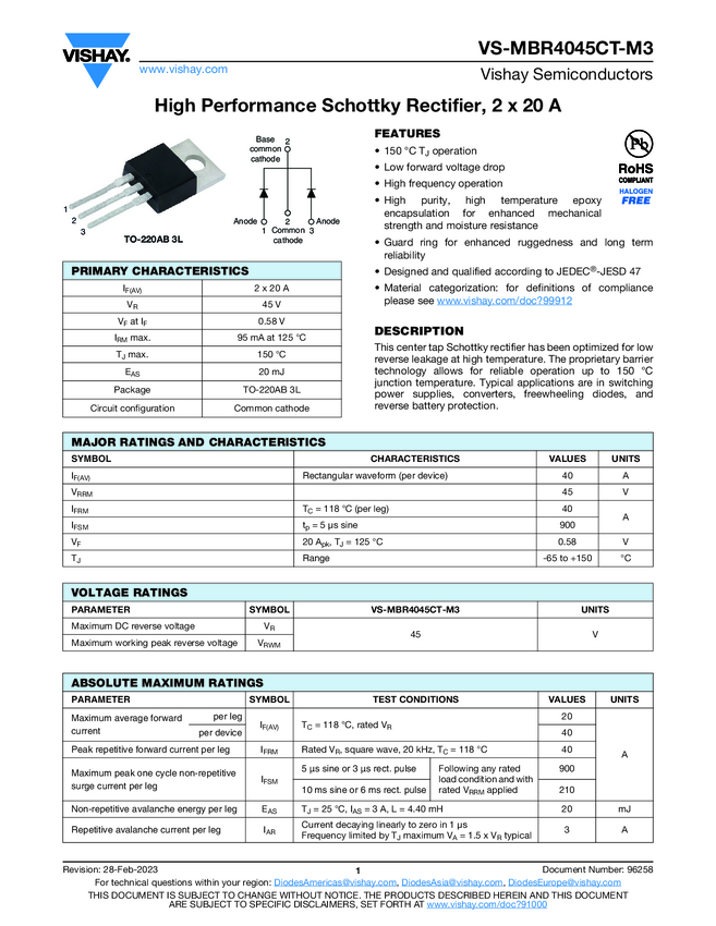 VS-MBR4045CT-M3 High Performance Schottky Rectifier, 2 x 20 A