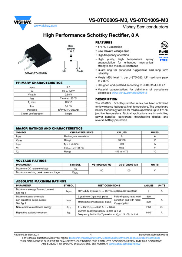 VS-8TQ100S-M3 High Performance Schottky Rectifier, 8 A