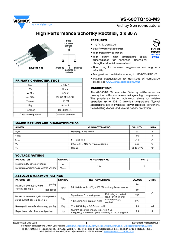 VS-60CTQ150-M3 High Performance Schottky Rectifier, 2 x 30 A