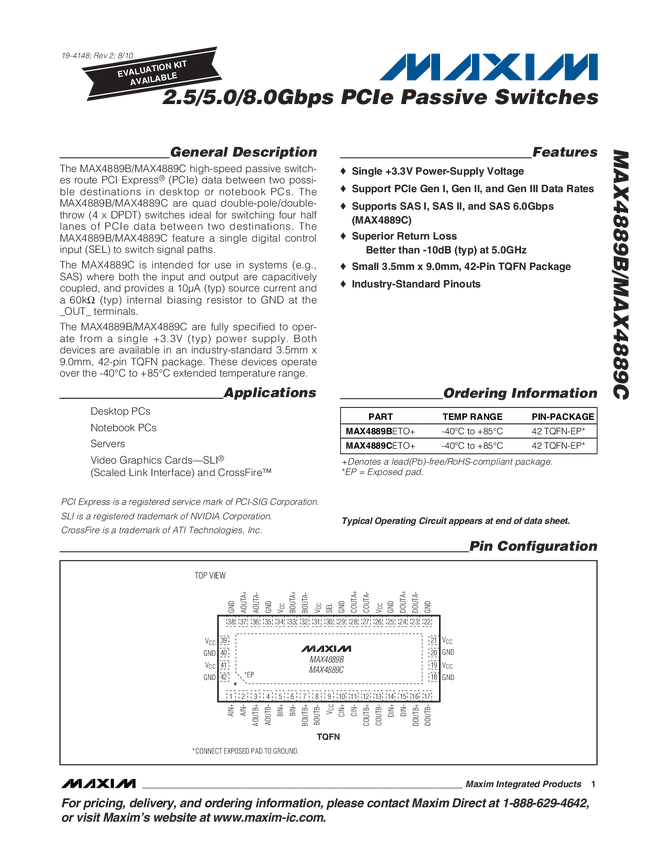 MAX4889C 2.5/5.0/8.0Gbps PCIe Passive Switch