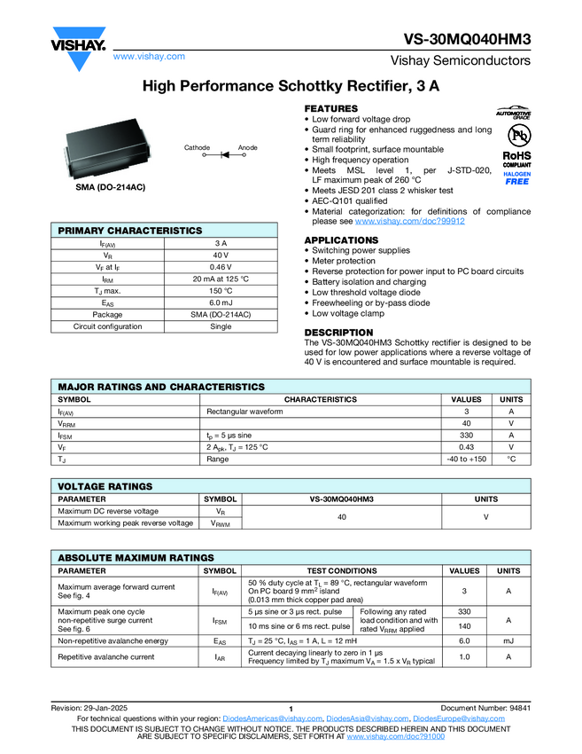 VS-30MQ040HM3 High Performance Schottky Rectifier, 3 A