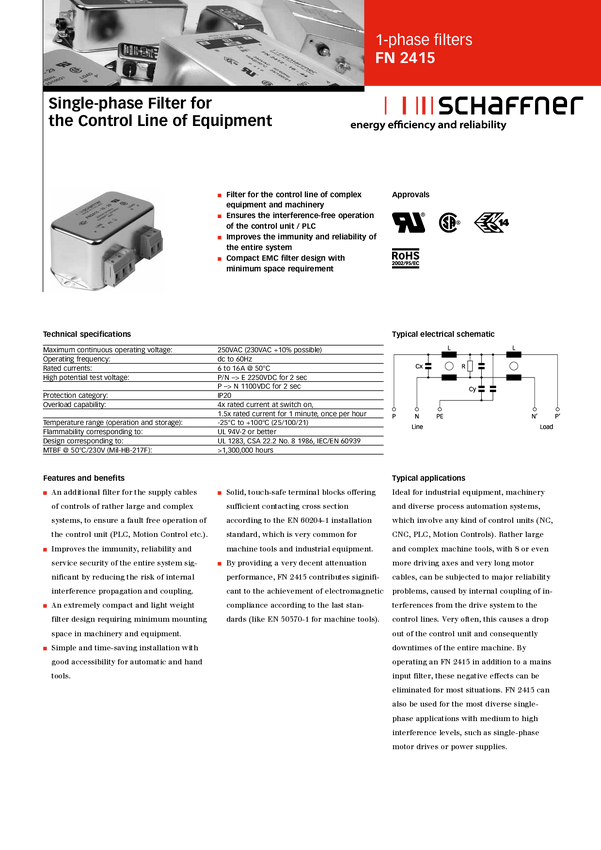 Filtr szumów Schaffner FN2415-6-29, 250 V/AC, 6 A