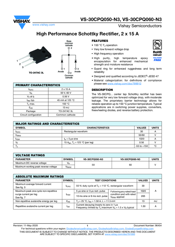 VS-30CPQ060-N3 High Performance Schottky Rectifier, 2 x 15 A