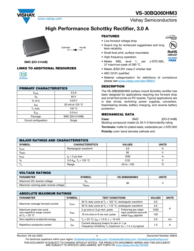 VS-30BQ060HM3 High Performance Schottky Rectifier, 3.0 A
