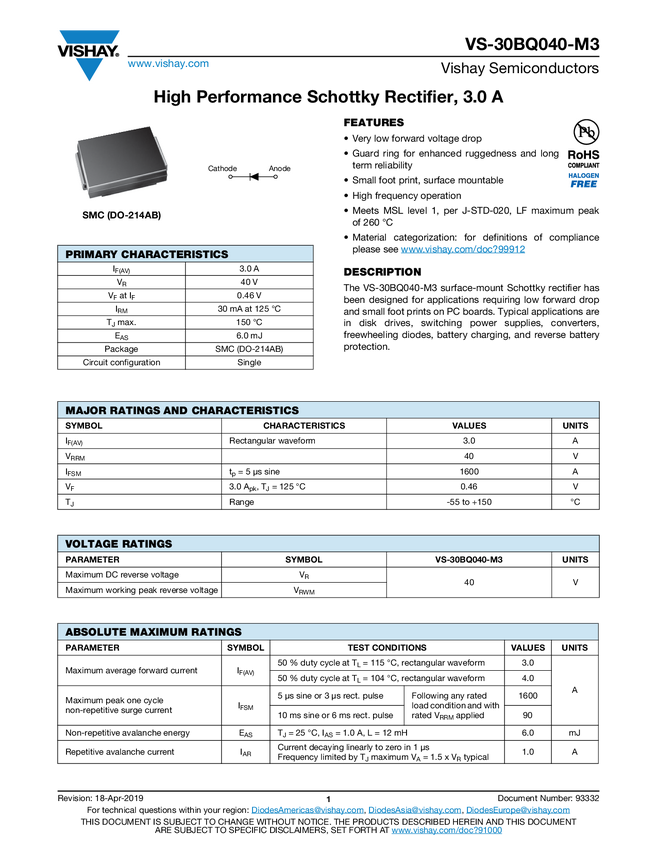 VS-30BQ040-M3 High Performance Schottky Rectifier, 3.0 A