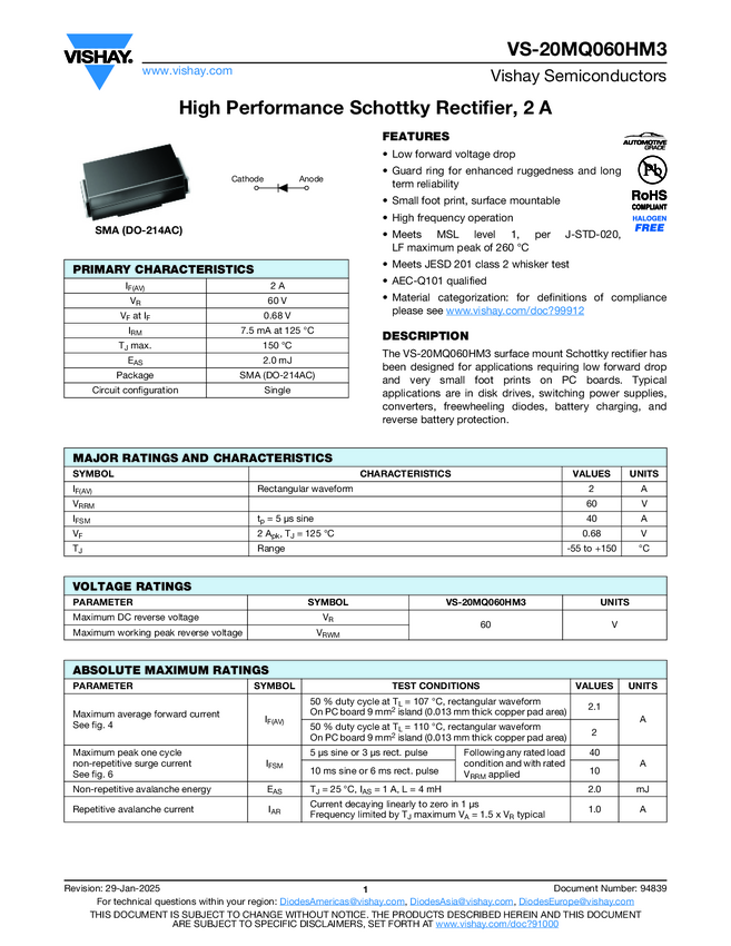 VS-20MQ060HM3 High Performance Schottky Rectifier, 2 A