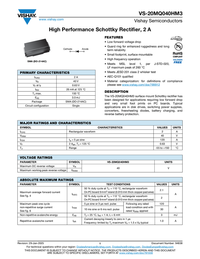 VS-20MQ040HM3 High Performance Schottky Rectifier, 2 A