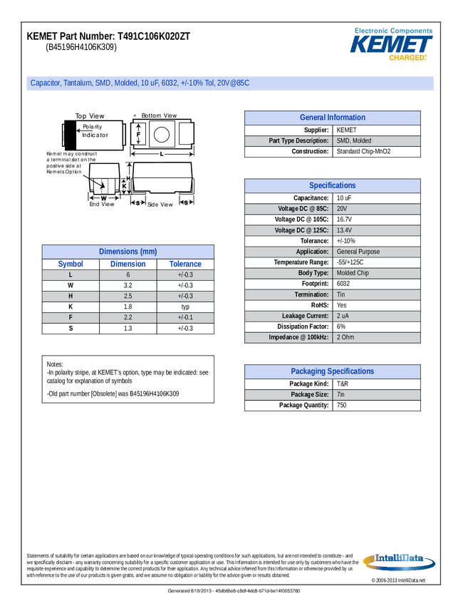 T491C106K020ZT Kondensator elektrolityczny tantalowy SMD, 10 uF, 10%