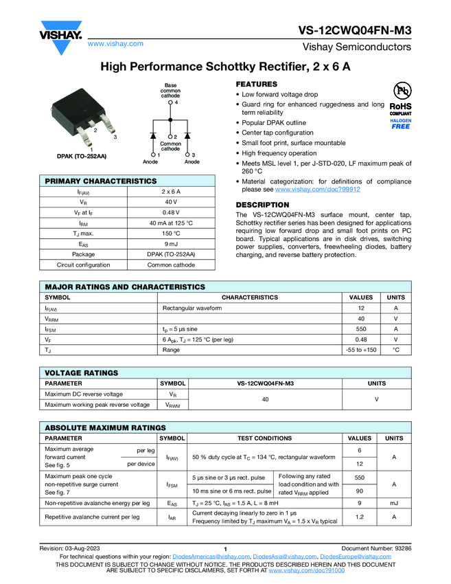 VS-12CWQ04FN-M3 High Performance Schottky Rectifier, 2 x 6 A
