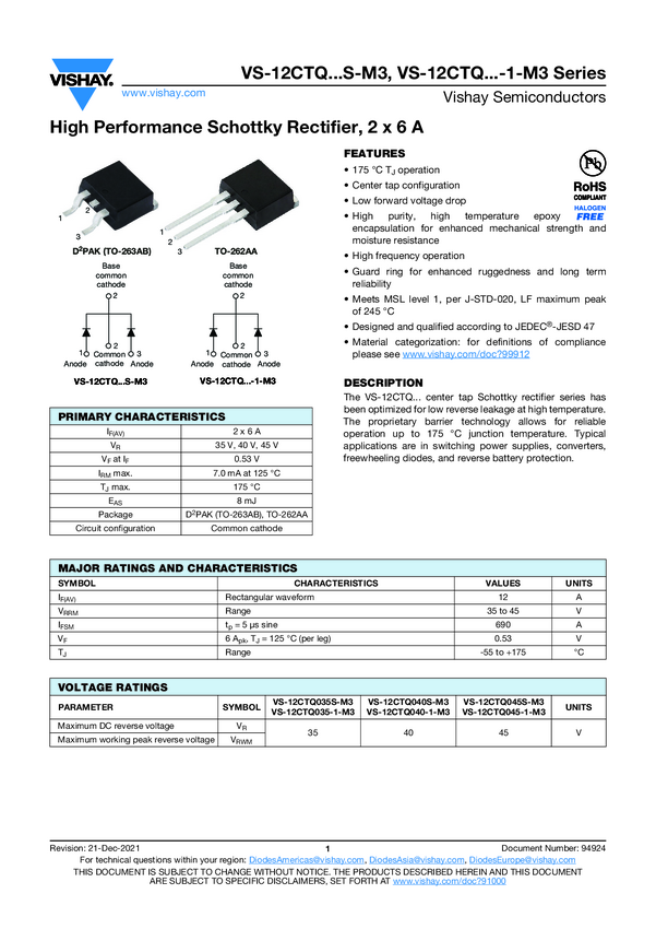 VS-12CTQ...S-M3 High Performance Schottky Rectifier, 2 x 6 A