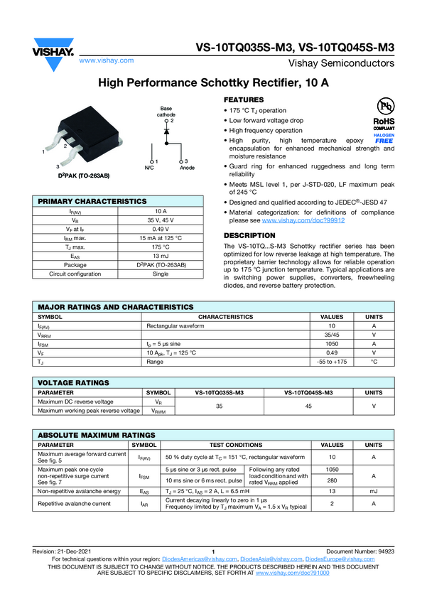 VS-10TQ045S-M3 High Performance Schottky Rectifier, 10 A