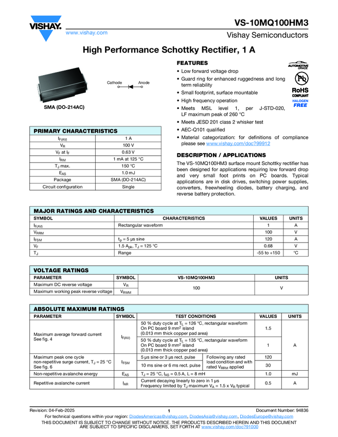 VS-10MQ100HM3 High Performance Schottky Rectifier, 1 A
