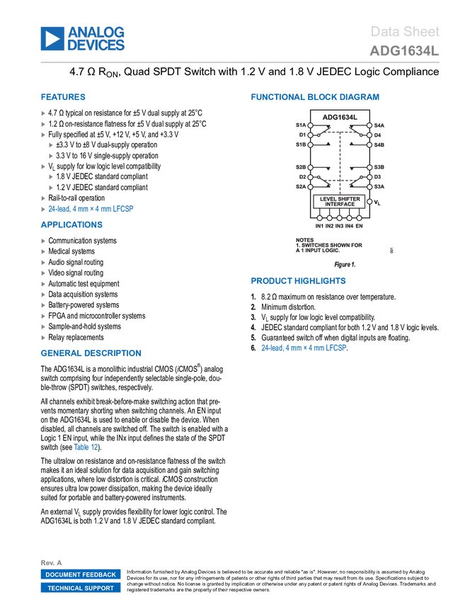 ADG1634L 4.7 Ω R, Quad SPDT Switch with 1.2 V and 1.8 V JEDEC Logic Compliance