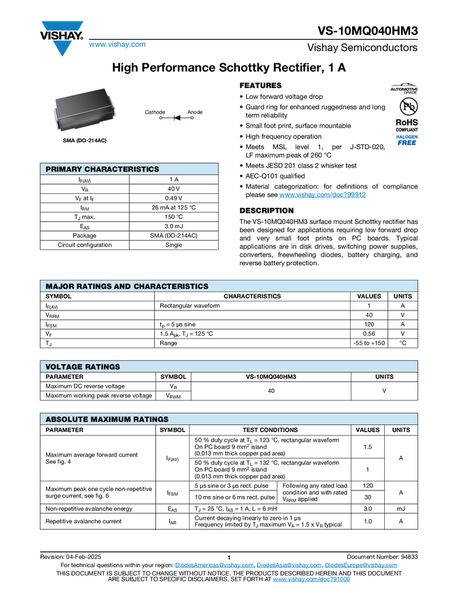 VS-10MQ040HM3 High Performance Schottky Rectifier, 1 A