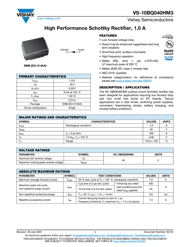 VS-10BQ040HM3 High Performance Schottky Rectifier, 1.0 A