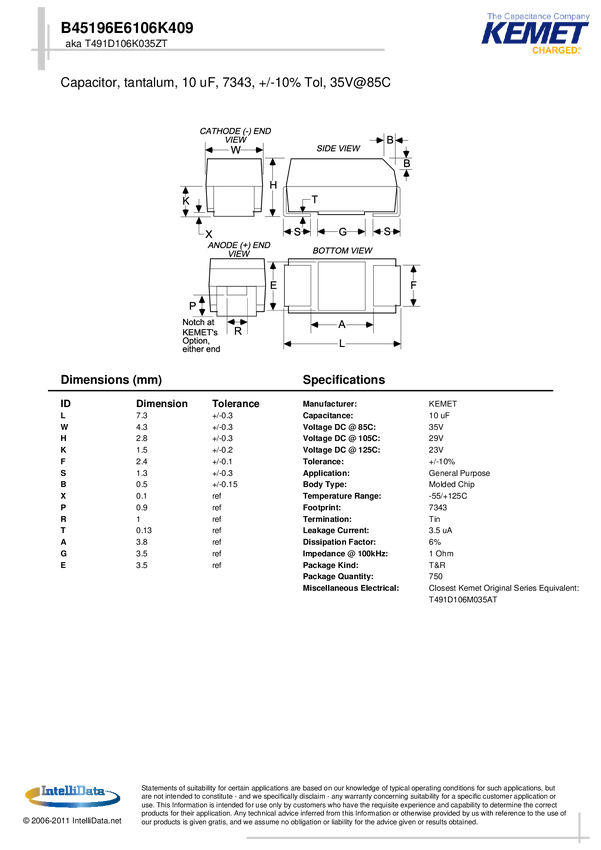 T491D106K035ZT Kondensator tantalowy SMD Kemet 10 UF 7343, +/-10% 35V@85C