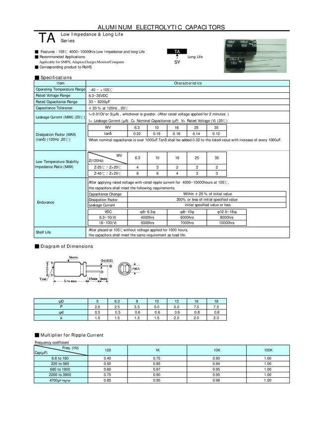 Kondensator elektrolityczny Alu-Elko, KTA477M035S1A5H20K, TA 470uF/35V 7000 STD.