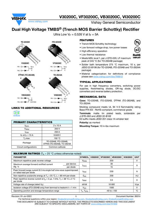 VB30200C Dual High Voltage TMBS® (Trench MOS Barrier Schottky) Rectifier Ultra...