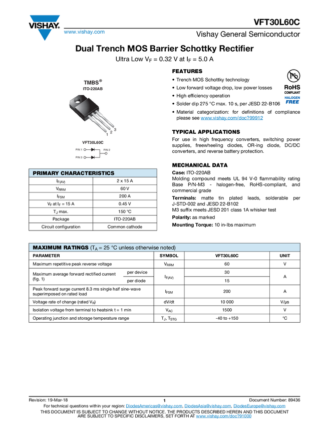 VFT30L60C Dual Trench MOS Barrier Schottky Rectifier Ultra Low VF = 0.32 V at IF = 5....