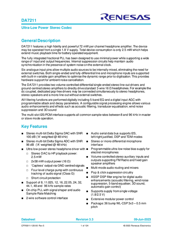 DA7211 Ultra-Low Power 1.8V Stereo Audio Codec with True-GND Headphone Driver