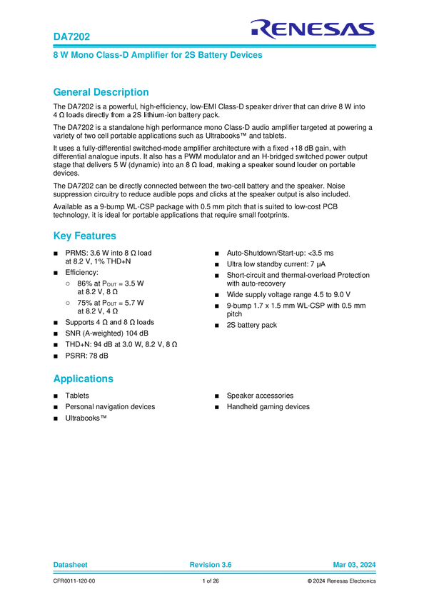 DA7202 8W Mono Class D Amplifier for 2S Battery-Operated Portable Devices