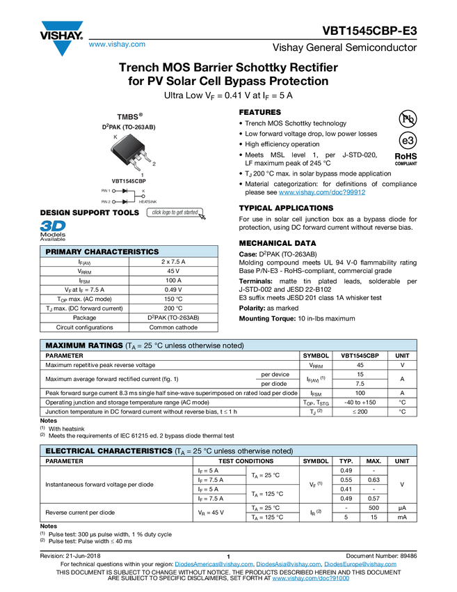 VBT1545CBP-E3 Trench MOS Barrier Schottky Rectifier for PV Solar Cell Bypass Protection U...