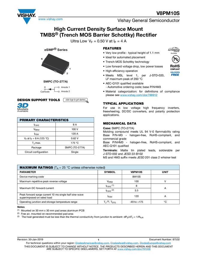 V8PM10S High Current Density Surface Mount TMBS® (Trench MOS Barrier Schottky)...