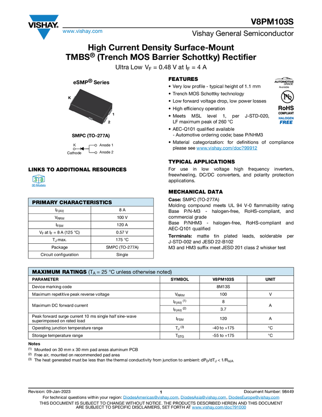 V8PM103S High Current Density Surface-Mount TMBS® (Trench MOS Barrier Schottky)...