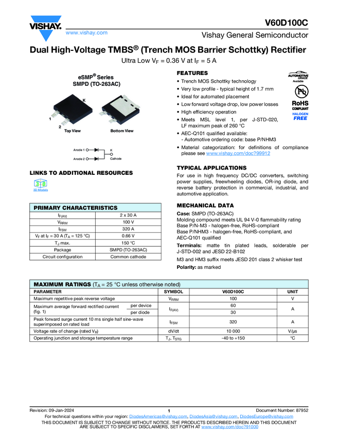 V60D100C Dual High-Voltage TMBS® (Trench MOS Barrier Schottky) Rectifier Ultra...